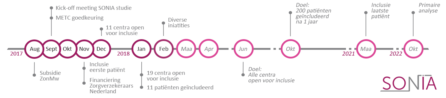 Inmiddels is de tiende patiënt geïncludeerd in de SONIA-studie. Het doel is om in oktober 2018, 200 patiënten te hebben geïncludeerd.